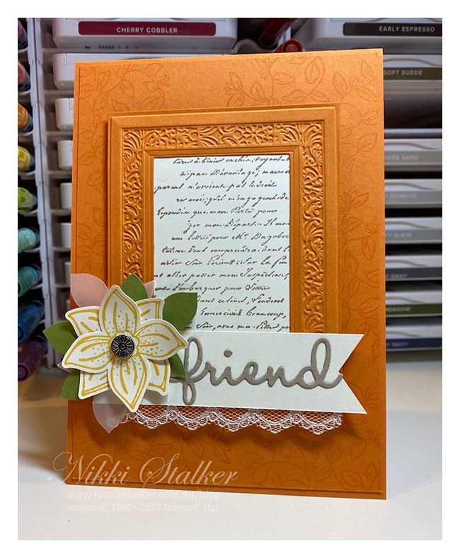 The card I’m sharing with you today is a CASE of the catalogue from page 12 (shown) and my team swap card for On Stage Sydney today.