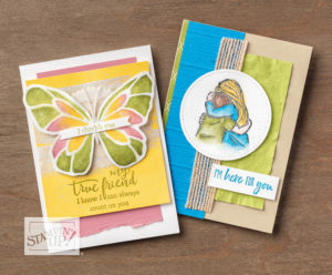 For my card I’m using Highland Heather, Balmy Blue & So Saffron. I’ve stamped my image onto Watercolour Paper using Versamark Ink and Heat Embossing using White Embossing Powder. I have then used and Aqua Painter and ink pads to watercolour my image before fussy cutting. My base card is Whisper White Thick which I have then added a strip of Balmy Blue card which I have torn the bottom edge. Next I have added a layer of So Saffron which I have stamped my sentiment using Memento Tuxedo Black ink before embossing using the Subtle Embossing Folder. There is a Vellum Scallop Circle added under the Butterfly which was cut using the Layering Circle Dies and Vellum cardstock. Finally I’ve stamped the ‘Happy Birthday’ image from Label Me Bold in Highland Heather onto Whisper White card and mounted on top of the Butterfly using mini Stampin’ Dimensionals.