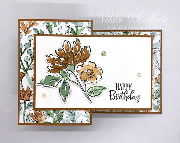The second card has a Soft Succulent card base. Soft Succulent isn’t listed as one of the colours in the Designer Series Papers but it matches quite well. I’ve used the other flower from the stamp set on this card which is stamped using Memento Tuxedo Black ink. The large flower is stamped using Pale Papaya. The next 2 sizes are stamped using Blushing Bride,the small duo flowers are in Daffodil Delight with the leaves being stamped in Soft Succulent.