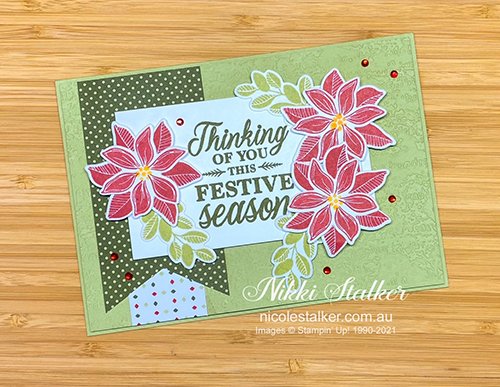 My colour combination has been taken from the Heartwarming Hugs dsp. I have used Real Red, Mossy Meadow and Pear Pizzazz, with a touch of Crushed Curry for the centres on the Poinsettias. The Merriest Moments bundle has so many great images, dies and a hybrid embossing folder giving you many options in your creations.
