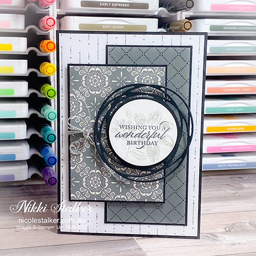 Next, I inked up the floral image with Smoky Slate ink. I stamped off lightly twice on scrap paper before stamping onto the Basic White cardstock. I have then stamped the sentiment over the top using Memento Tuxedo Black before die cutting using the Layering Circles Dies.